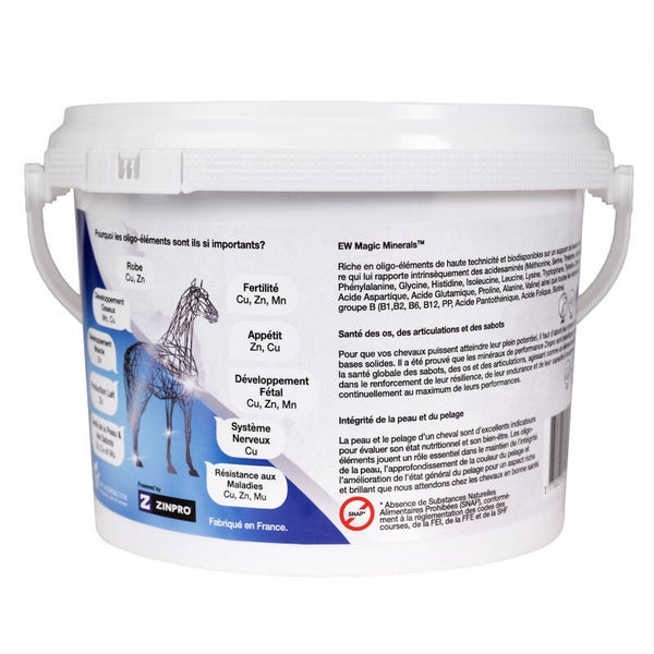 EW Magic Minerals ™ est riche en oligo-éléments (zinc, cuivre, manganèse) de haute technicité indispensable pour la santé des os, des articulations, des sabots ainsi que pour l’intégrité de la peau et du pelage, biodisponible sur une base de levure de bière contenant également toutes les vitamines du groupe B (B1, B2, B6, B12).